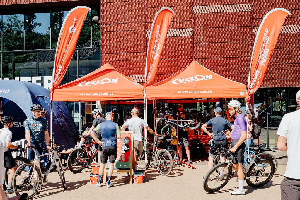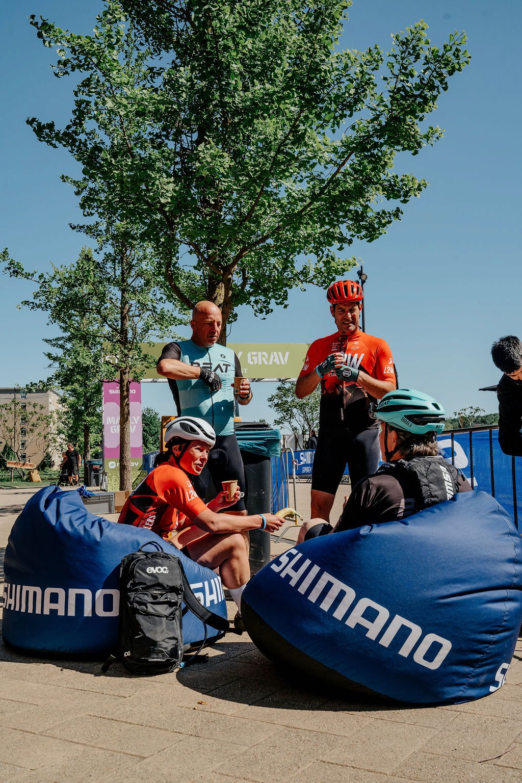 On the grass field next to the Shimano Experience Center, you will find the sampling zone: the place where the gravel world comes together. After your ride, you can enjoy a free drink here and receive a medal if you have won one.